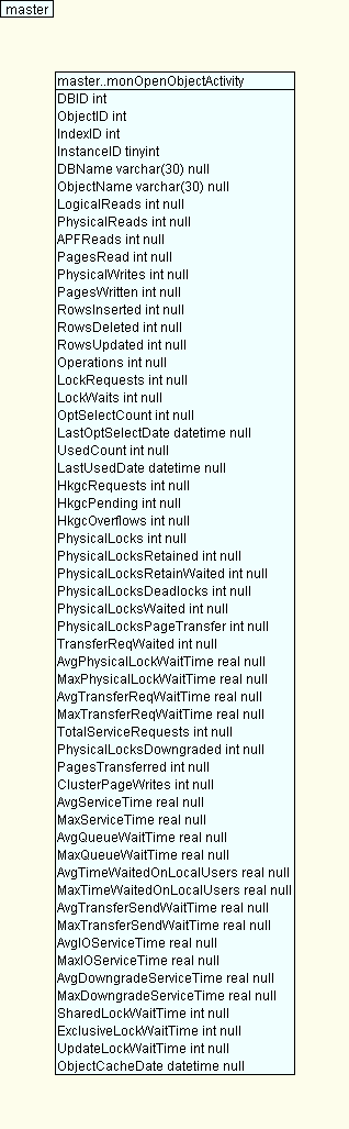 1 create table monOpenObjectActivity(-- 0 Rows, Data: 2 KB, Index: 0 B