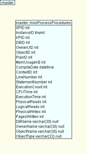 1 create table monProcessProcedures(-- 0 Rows, Data: 2 KB, Index: 0 B