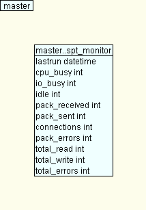 1 create table spt_monitor(-- 1 Rows, Data: 2 KB, Index: 0 B 2 lastrun datetime not null, 3 cpu_busy int not null, 4 io_busy int not null, 5 idle int not null, 6 pack_received int not null, 7 pack_sent int not null, 8 connections int not null, 9 pack_errors int not null, 10 total_read int not null, 11 total_write int not null, 12 total_errors int not null 13 ) 14 15 Grant Select on spt_monitor to public 16