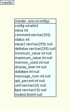 1 create table syscurconfigs(-- 0 Rows, Data: 0 B, Index: 0 B