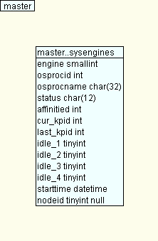 1 create table sysengines(-- 0 Rows, Data: 0 B, Index: 0 B 2 engine smallint not null, 3 osprocid int not null, 4 osprocname char(32) not null, 5 status char(12) not null, 6 affinitied int not null, 7 cur_kpid int not null, 8 last_kpid int not null, 9 idle_1 tinyint not null, 10 idle_2 tinyint not null, 11 idle_3 tinyint not null, 12 idle_4 tinyint not null, 13 starttime datetime not null, 14 nodeid tinyint null 15 ) 16 17 Grant Select on sysengines to public 18