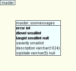 1 create table sysmessages(-- 9.6 KRows, Data: 1 MB, Index: 1.3 MB 2 error int not null, 3 severity smallint not null, 4 dlevel smallint not null, 5 description varchar(1024) not null, 6 langid smallint null, 7 sqlstate varchar(5) null 8 ) 9 10 create unique index ncsysmessages on sysmessages(-- 254 KB refcount: 157 11 error, dlevel, langid 12 ) 13 create clustered index sysmessages on sysmessages(-- 1 MB refcount: 0 14 error, dlevel 15 ) 16 17 Grant Select on sysmessages to public 18