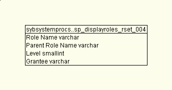 1 create table sp_displayroles_rset_004(-- 0 Rows, Data: 0 B, Index: 0 B 2 [Role Name] varchar(30) not null, 3 [Parent Role Name] varchar(30) not null, 4 [Level] smallint not null, 5 Grantee varchar(30) not null 6 ) 7