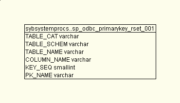 1 create table sp_odbc_primarykey_rset_001(-- 0 Rows, Data: 0 B, Index: 0 B 2 TABLE_CAT varchar(32) not null, 3 TABLE_SCHEM varchar(32) not null, 4 TABLE_NAME varchar(255) not null, 5 COLUMN_NAME varchar(255) not null, 6 KEY_SEQ smallint not null, 7 PK_NAME varchar(255) not null 8 ) 9