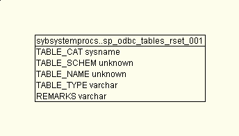1 create table sp_odbc_tables_rset_001(-- 0 Rows, Data: 0 B, Index: 0 B 2 TABLE_CAT sysname not null, 3 TABLE_SCHEM unknown not null, 4 TABLE_NAME unknown not null, 5 TABLE_TYPE varchar(8) not null, 6 REMARKS varchar(254) not null 7 ) 8