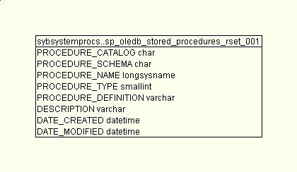 | sybsystemprocs | sp_oledb_stored_procedures_rset_001 | 01 Jan 70 | Joins Schema ColumnUsage Queries Dependencies |