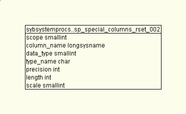 | sybsystemprocs | sp_special_columns_rset_002 | 01 Jan 70 | Joins Schema ColumnUsage Queries Dependencies |