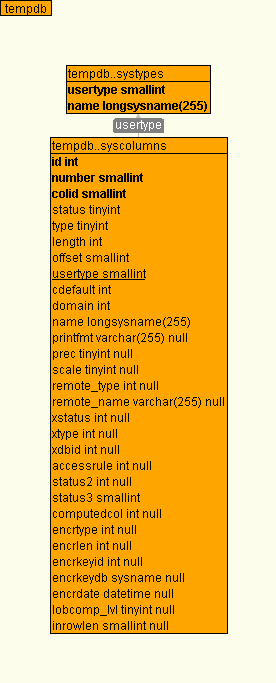 | From Columns | To Table | To Columns | Cnt | Cstr | Strength | | [usertype] | tempdb..systypes | [usertype] | 2 | | FK |